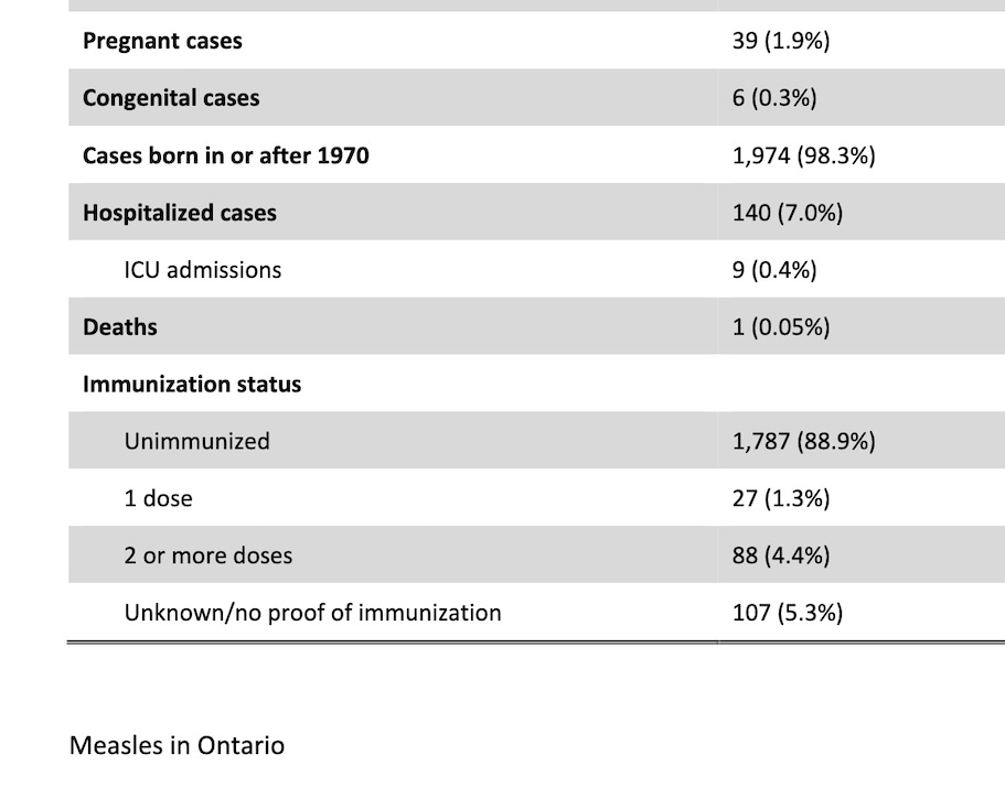 In the measles outbreak in Ontario, Canada, among about 2,000 cases, just over 100 children have been hospitalized and there have been six cases of congenital measles.