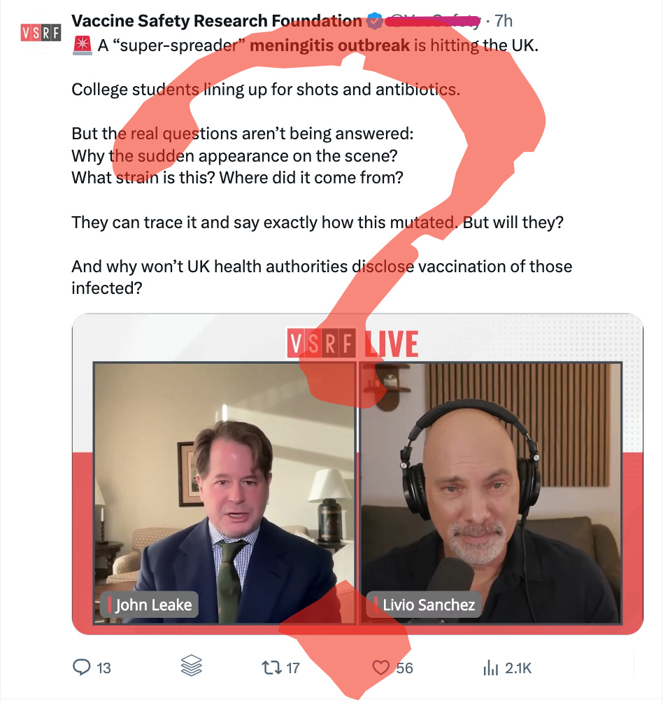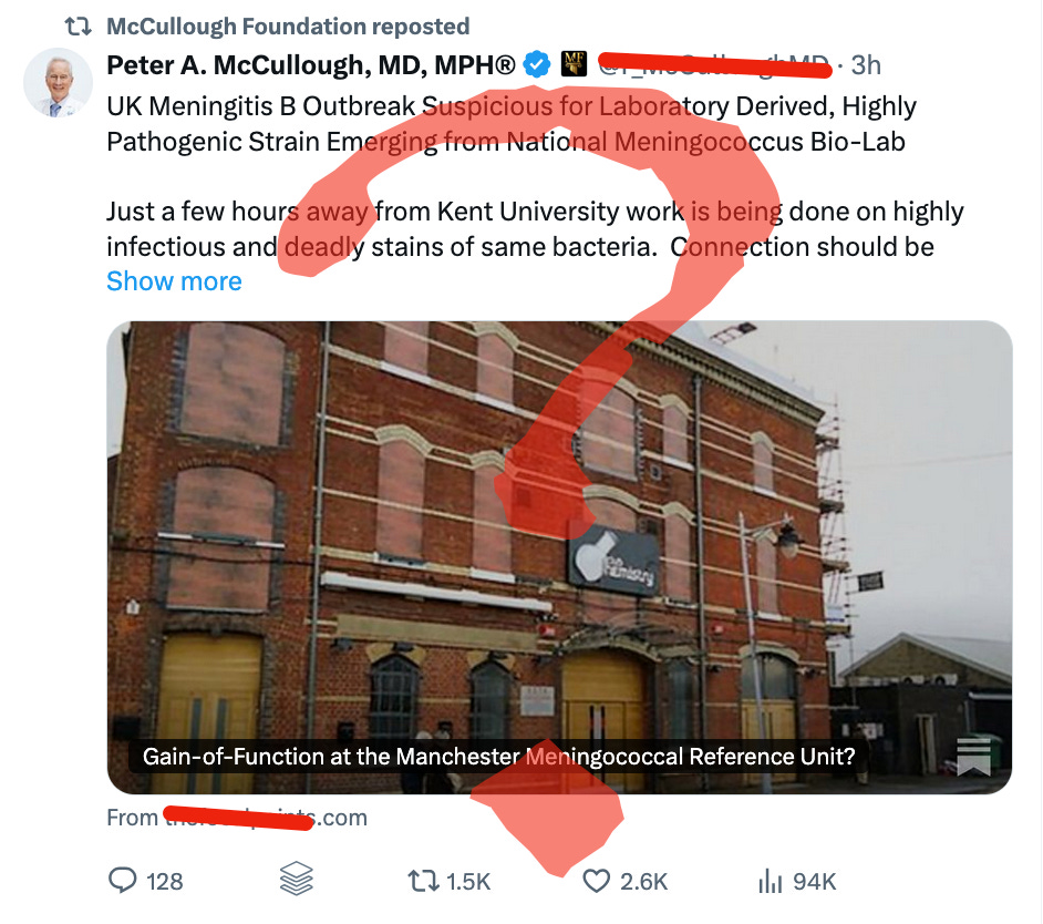 We have Peter McCullough proposing a lab leak theory as the source for the Men B outbreak that has sickened 29 children and teens and killed two.