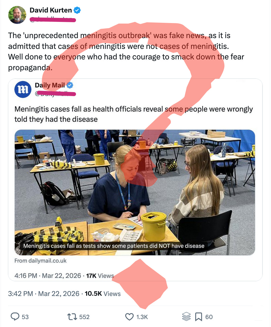 The folks who believe the COVID pandemic was planned are now pushing the idea that the men B outbreak in Kent was planned.