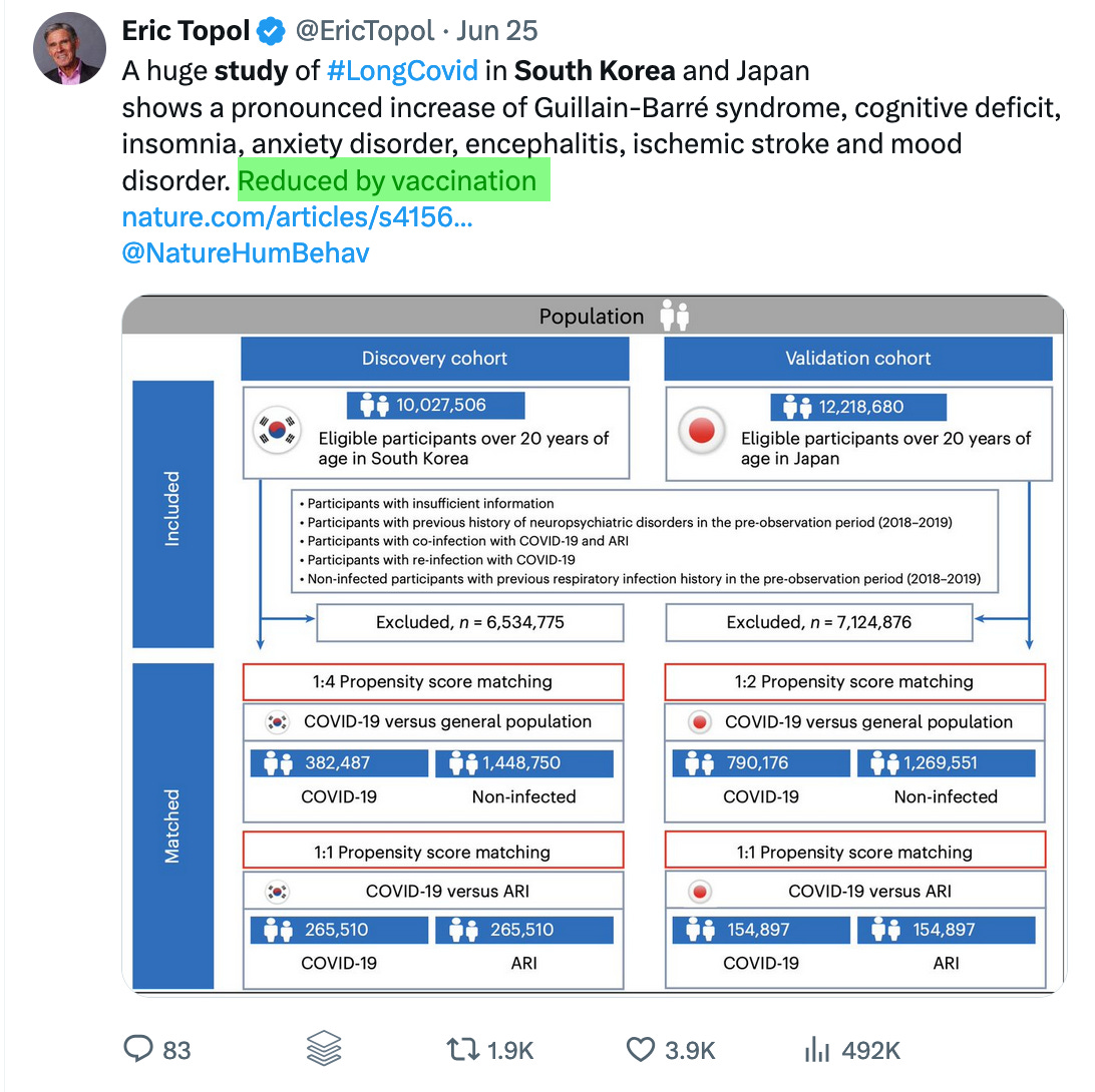 The study, Short- and long-term neuropsychiatric outcomes in long COVID in South Korea and Japan, found that getting vaccinated against COVID reduced your risk of long-term risk of adverse neuropsychiatric outcomes after a COVID infection!