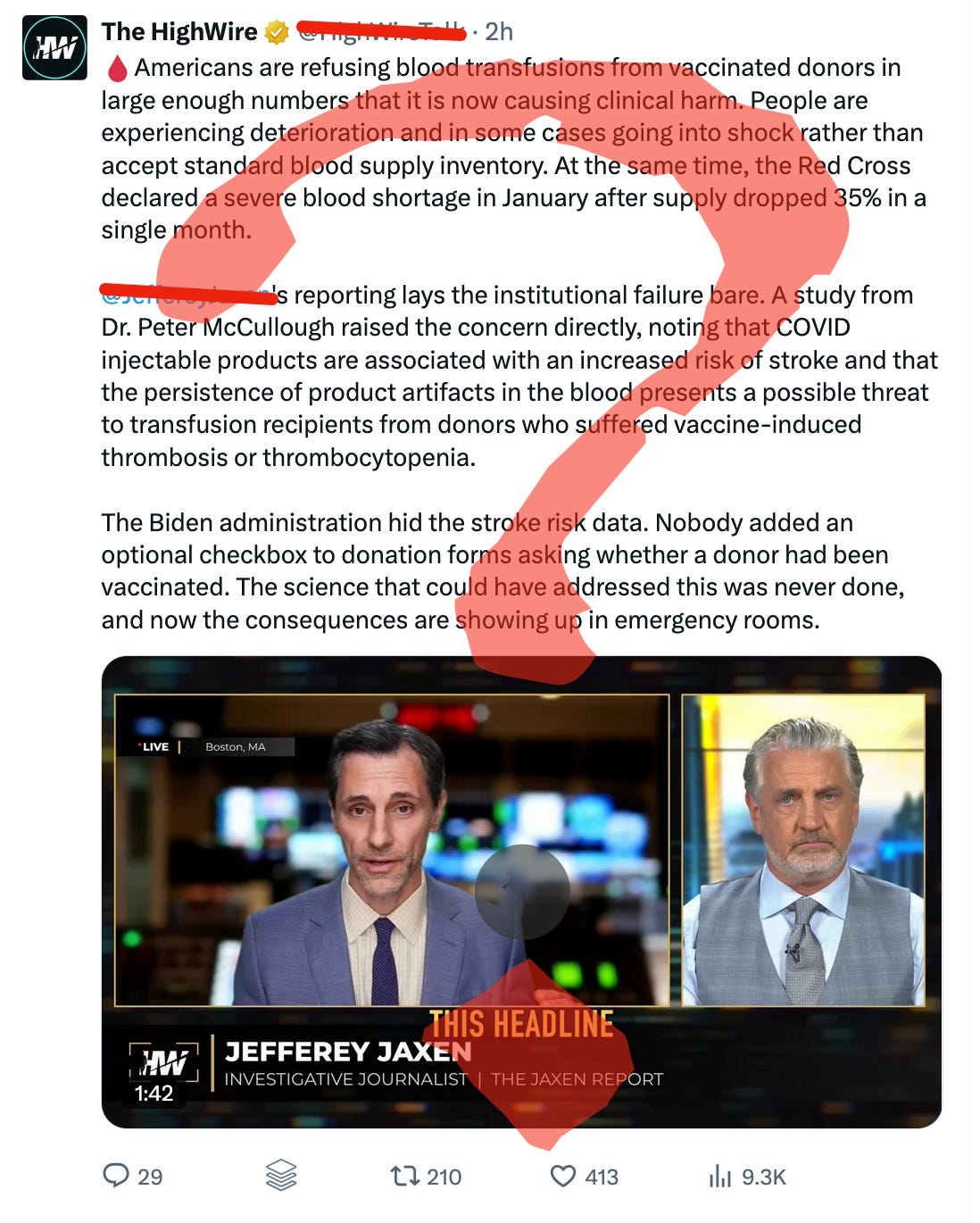 Jefferey Jaxen and Del Bigtree seem to be implying that the severe blood shortage at the Red Cross is related to folks wanting vaccinated blood, aren’t they?