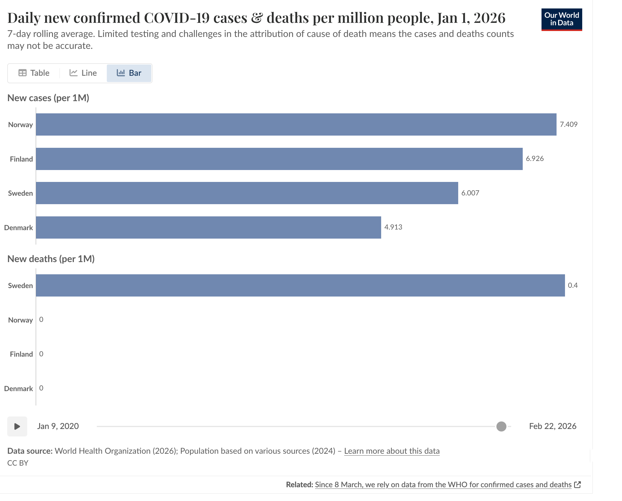 OWiD. Daily new confirmed COVID-19 cases & deaths per million people, Jan 1, 2026