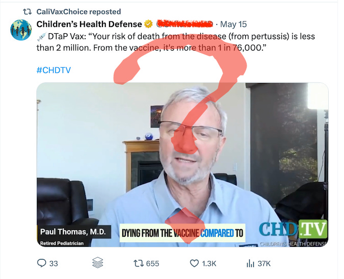 And then the most damning of all evidence is the information about what is your chance of dying from the vaccine compared to what's your chance of dying from the disease. And the answer to that is rather shocking. Your risk of death from the disease from pertussis is less than 2 million. From the vaccine, it's more than 1 in 76,000. So we're talking 30 times more likely that the vaccine will kill you than the disease.” — we have already shown how Paul Thomas is wrong about your risk of dying from pertussis. What about the risk from the vaccine? He is simply talking about VAERS reports and not true vaccine deaths.“