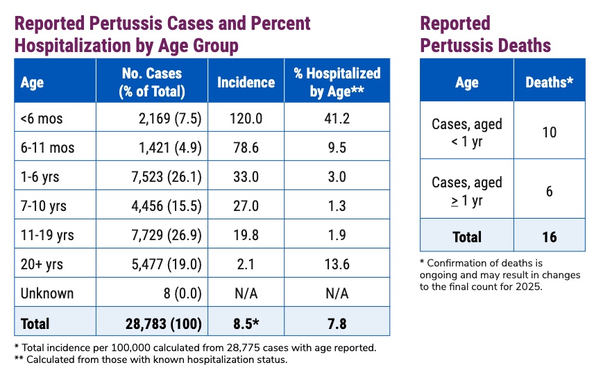 Last year, in 2025, there were at least 16 deaths from pertussis, with most in younger newborns and/or infants under 12 months of age.