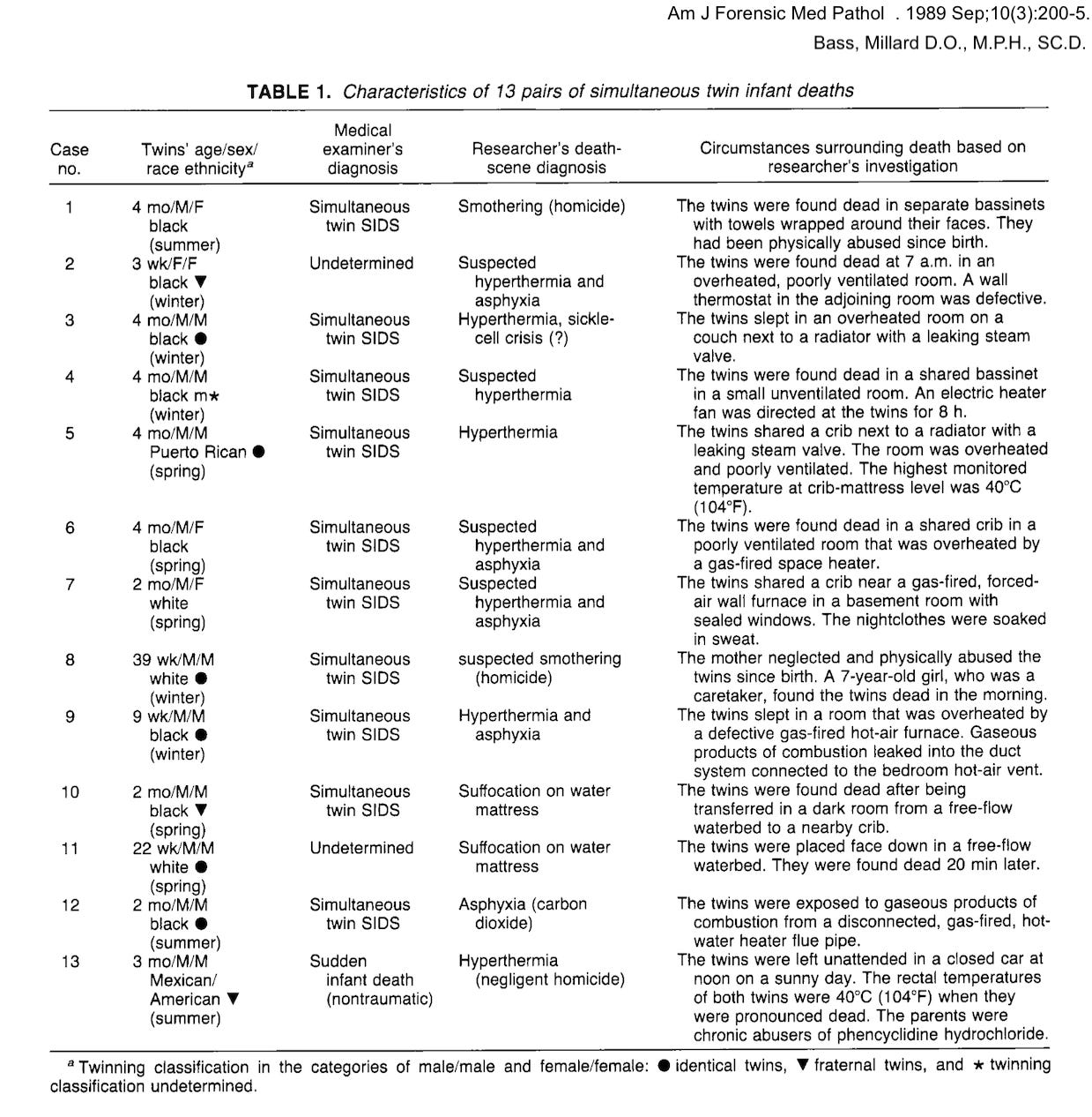 Ramos V, Hernández AF, Villanueva E. Simultaneous death of twins. An environmental hazard or SIDS? Am J Forensic Med Pathol. 1997 Mar;18(1):75-8. doi: 10.1097/00000433-199703000-00014. PMID: 9095306.