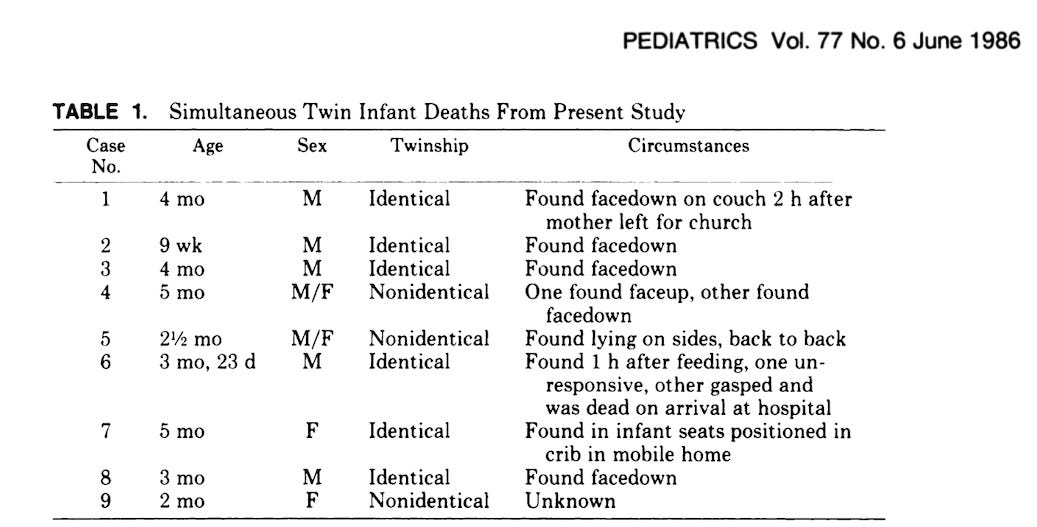 Smialek JE. Simultaneous sudden infant death syndrome in twins. Pediatrics. 1986 Jun;77(6):816-21. PMID: 3754958.