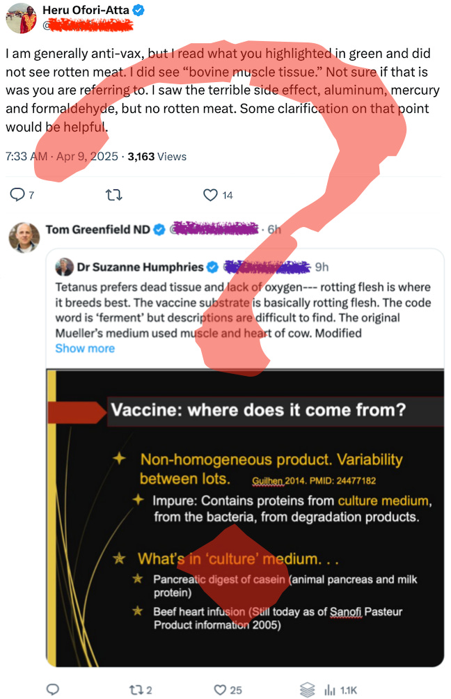 But does that really sound like evidence to support her claim that they used rotten meat to make vaccines?