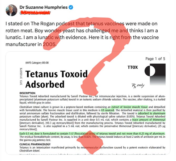 Her evidence apparently is the package insert for a tetanus vaccine which states that “Clostridium tetani culture is grown in a peptone-based medium containing an extract of bovine muscle tissue and detoxified with formaldehyde. The bovine muscle tissue used in this medium in US sourced.”