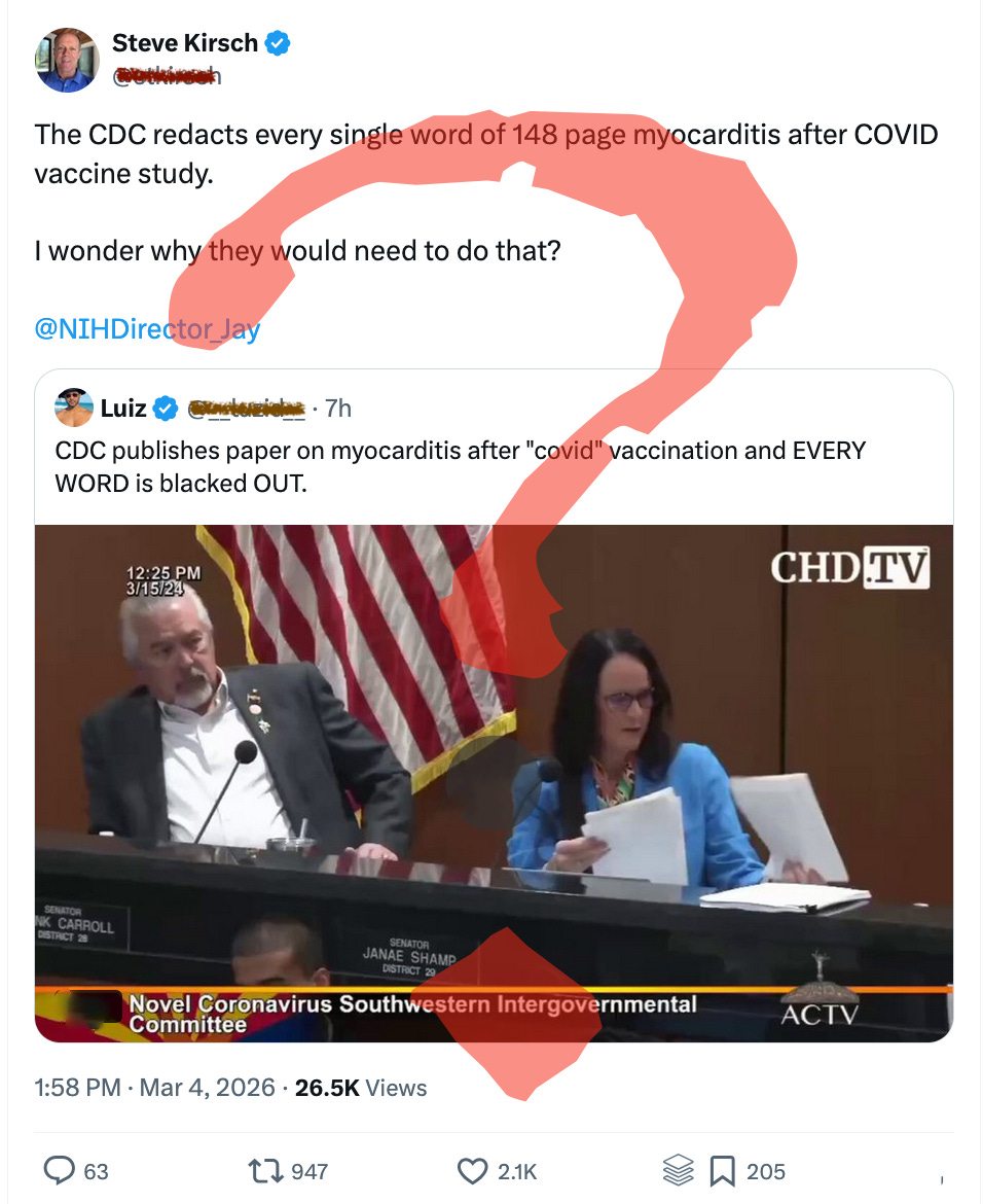 The idea of a redacted study took off after Zachary Stieber posted the redacted documents in 2024 and a few weeks later by Arizona State Senator Janae Shamp.