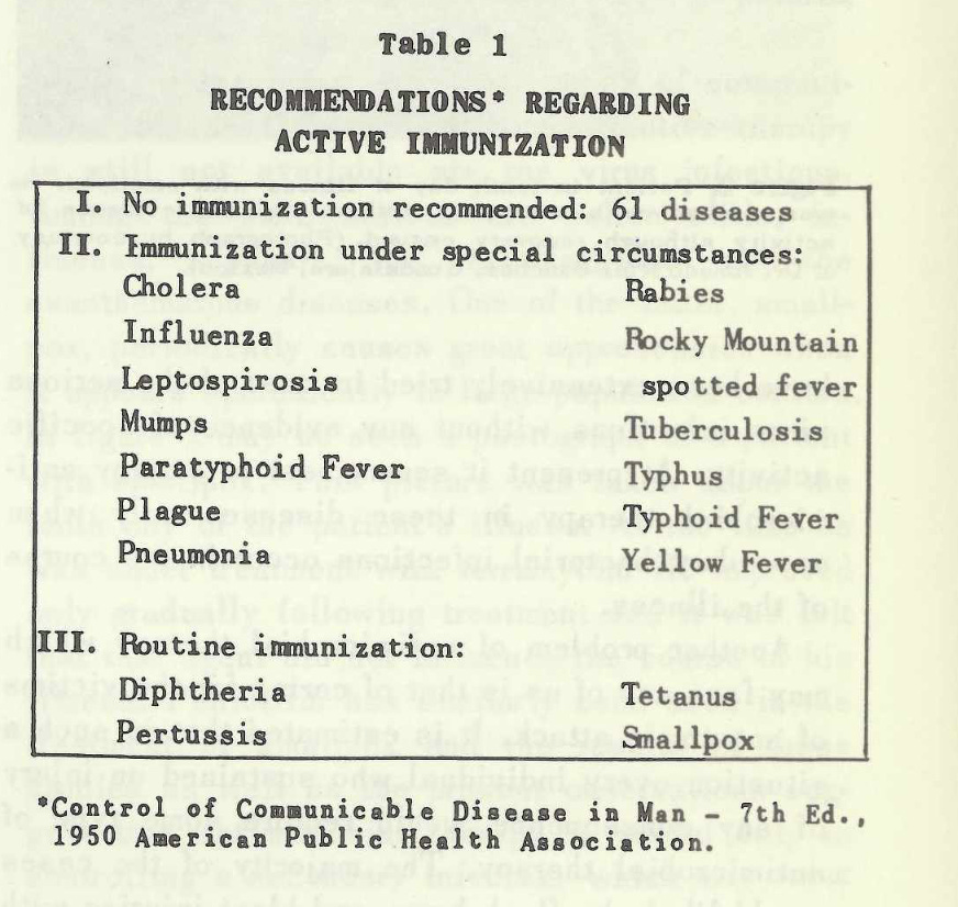 “For 13 diseases immunization is recommended with certain limitations or restrictions, and for only 4 diseases, smallpox, diphtheria, whooping cough, and tetanus, is routine immunization recommended.”