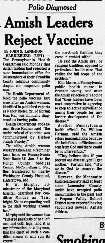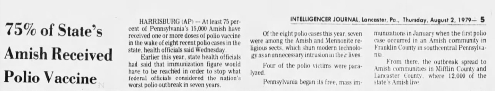 For example, in 1979, when a polio outbreak started, Amish leaders initially refused to get their members vaccinated and protected.