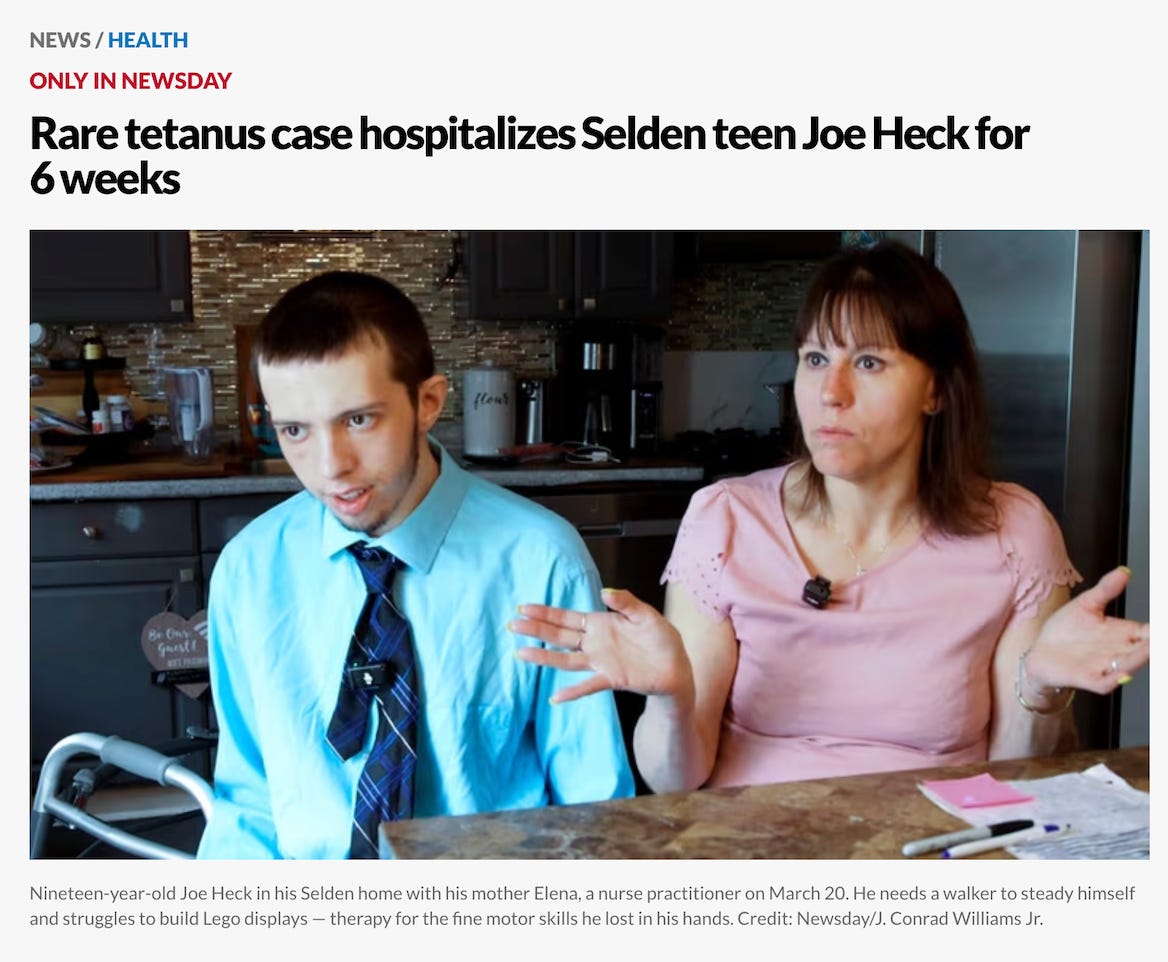 Rare tetanus case hospitalizes Selden teen Joe Heck for 6 weeks. https://www.newsday.com/news/health/tetanus-selden-teen-dust-t7o9fyvh